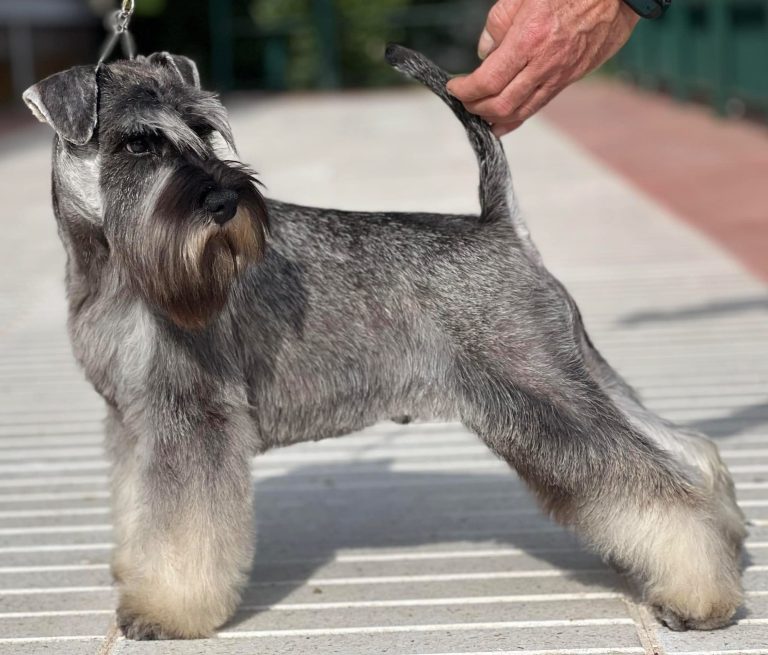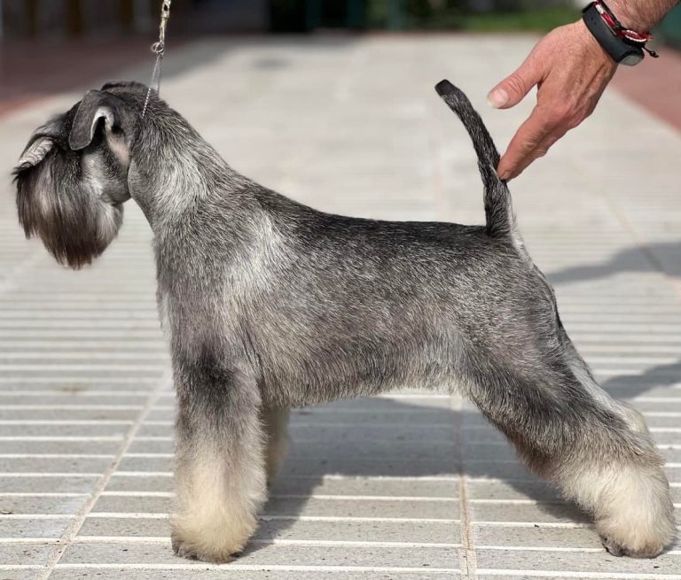 Uno de nuestros campeones, Faruk, nos ayuda a mostrar cómo el stripping saca lo mejor de cada Schnauzer: un pelo con textura, brillo y forma impecable, listo para brillar en su próxima exposición.