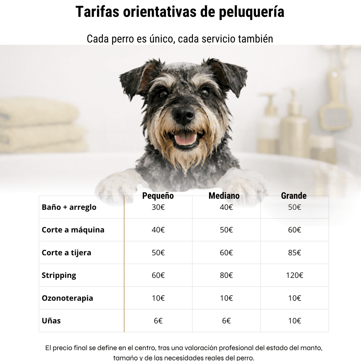 Para ayudarte a orientarte, hemos preparado esta calculadora con precios aproximados. En Peluquería Canina Anthares trabajamos con técnica profesional, especialmente en schnauzers y razas de pelo duro, y siempre recomendamos el servicio más adecuado tras revisar el manto en persona. Introduce los datos de tu perro y obtén una estimación rápida.